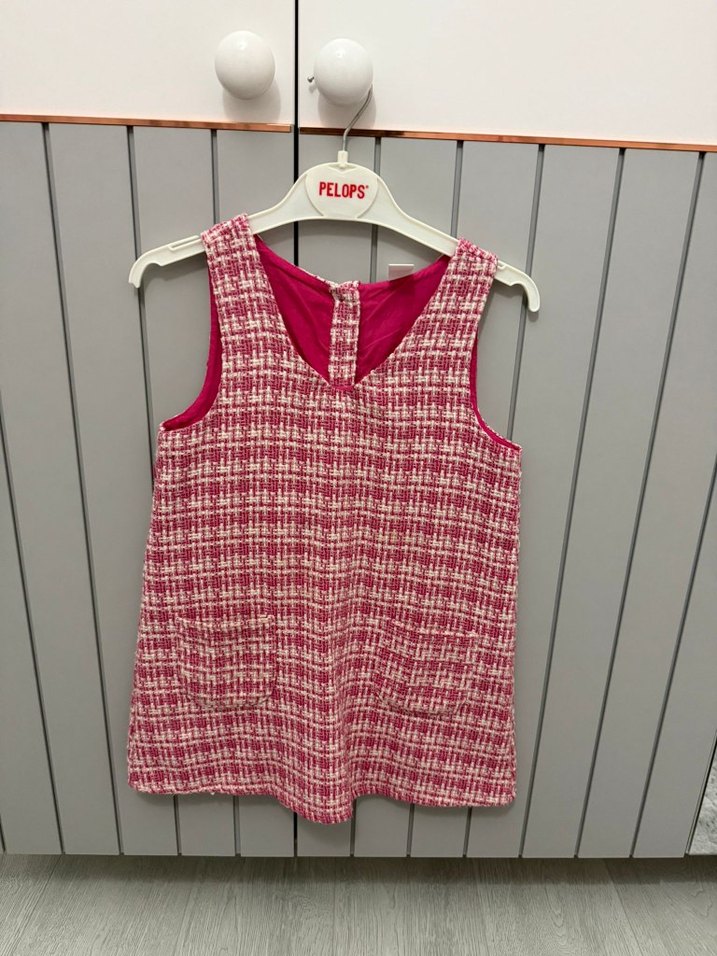V yakalı, kolsuz pembe örme kız çocuk elbisesi. Renkli batik desenli, regular fit. Sokak modasına uygun. PELOPS markalı.