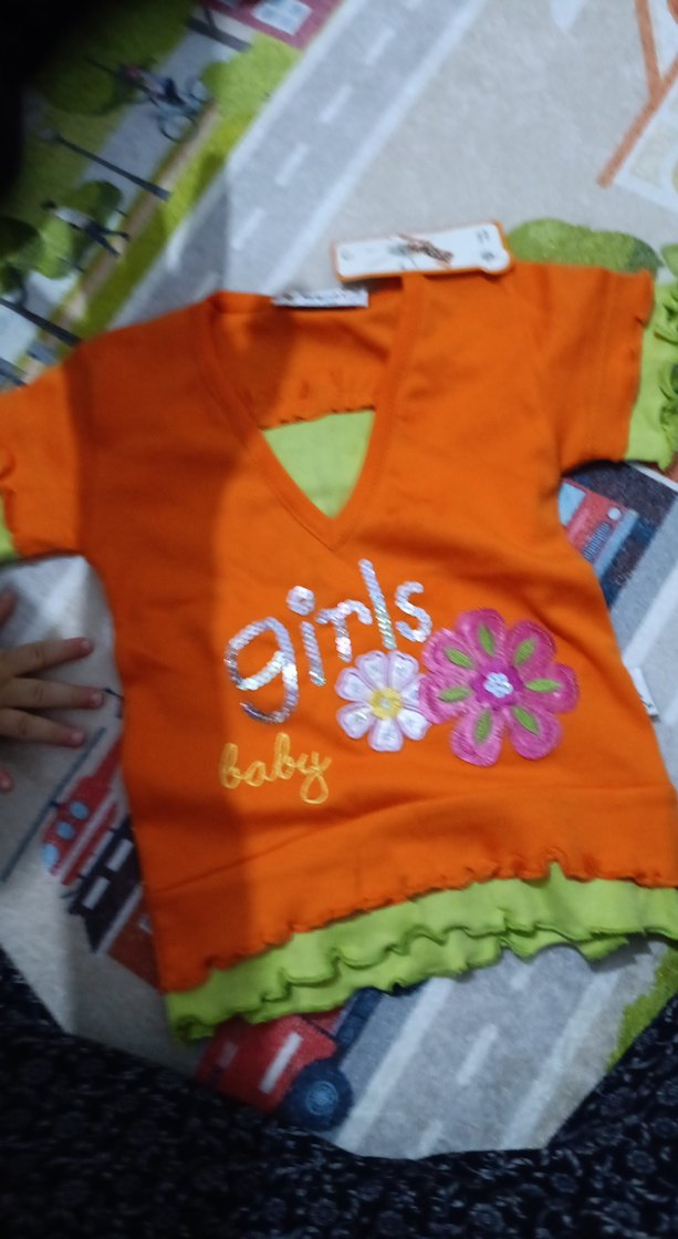 Kısa kollu, V yakalı, renkli baskılı ve fırfırlı detaylı kız çocuk tişörtü. "Baby" yazısı baskıda yer alır.