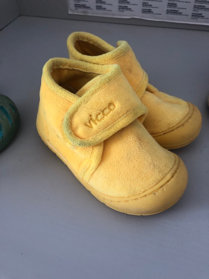 Yumuşak kumaştan sarı kız çocuk sıcak terlik, bantlı. Düz, sokak stiline uygun.Kısa süreli kullanıldı.