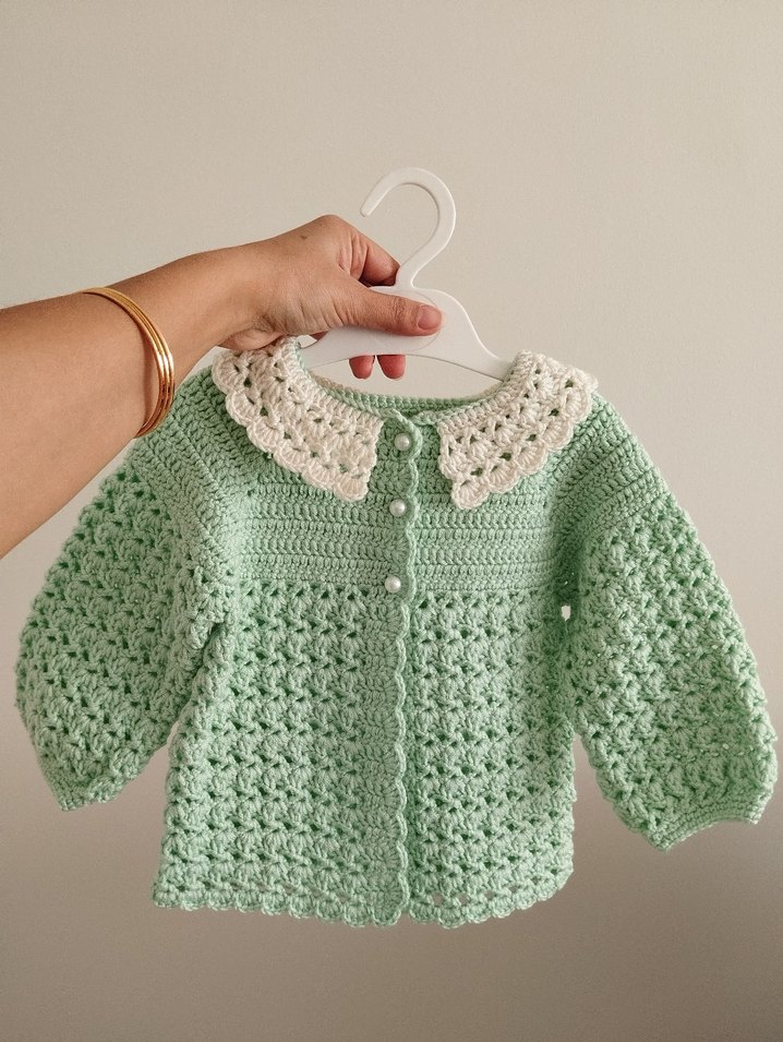 Vintage tarzda, beyaz örme yakalı, uzun kollu, bol kesim pastel yeşil örme kız çocuk hırkası. İnci düğmeli ve yumuşak dokulu.