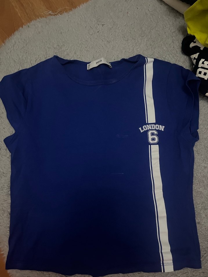 Koyu mavi renkli, denim kumaştan, kısa kollu ve bisiklet yaka kız çocuk tişörtü. Dikey baskılı çizgi ve "LONDON 6" yazısı ile dikkat çeker.