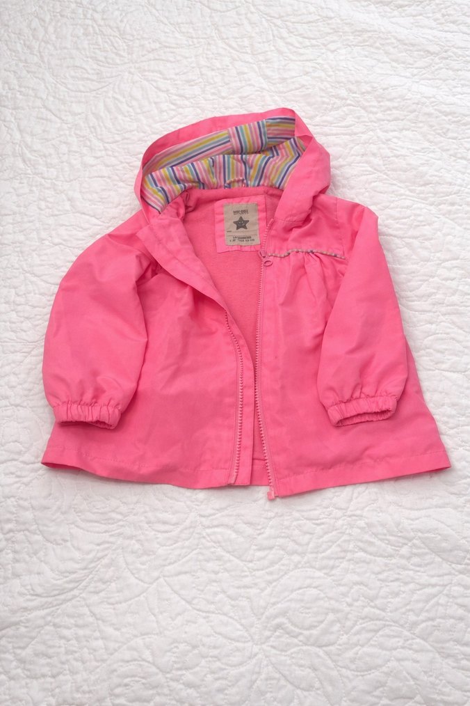Renkli pembe kız çocuk yağmurluğu, kapüşonlu ve fermuarlı. Yumuşak ve sıcak kumaştan, bol kesim ve lastikli manşetli.