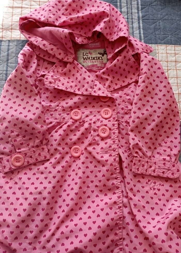 Kız çocuk yağmurluk ürün kullanılmıştır önde kolunda birer düğmesi eksik göründüğü gibi