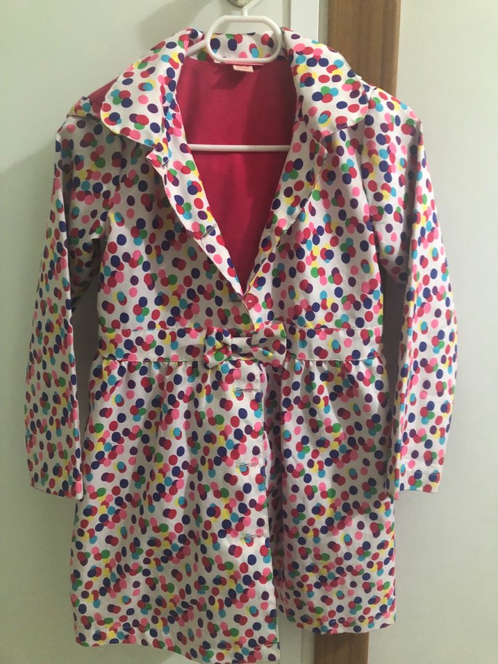 Renkli baskılı, düğmeli ve yakalı kız çocuk yağmurluğu. Rahat kesimli ve yumuşak kumaştan, sokak stili için uygun. Kapüşonlu çıkartılabiliyor aşırı güzel ve sorunsuz