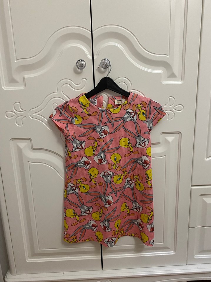 Pembe, renkli baskılı, kısa kollu, bisiklet yakalı, düğme detaylı, sentetik kumaştan kız çocuk tişörtü. Trendy ve rahat bir stil için uygundur.