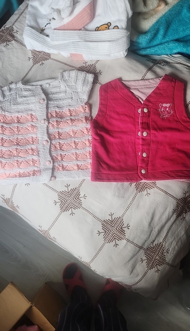 Pembe pamuklu, düğmeli, baskılı ve V yaka kız çocuk yeleği, rahat kalıp ve kolsuz tasarımla sokak stiline uygun. Biri el örgüsü diğeri çift taraflı kullanıma uygun. 2sinin fiyatıdır.alacak olan pişman olmaz şimdiden güle güle kullanılsın.