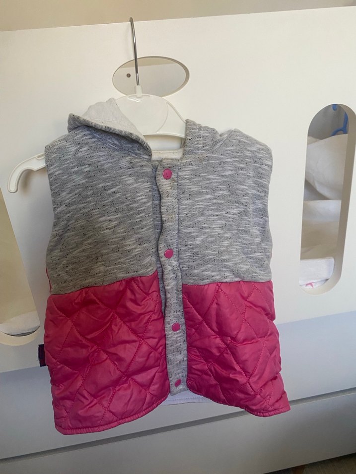 Düğmeli ön kısmı, askısız yakası ve bol kesimiyle kız çocuk yeleği. Yumuşak sentetik kumaştan, gri üst ve pembe kapitone alt kısmı ile trend sokak stili için uygun. 1/2 yaş uyumlu