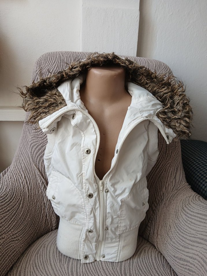 Beyaz, kısa kesim ve fitted yelek, kürk detaylı kapüşon ve yakaya sahip. Sentetik kumaştan üretilmiş, günlük rahat ve şık bir tasarım.