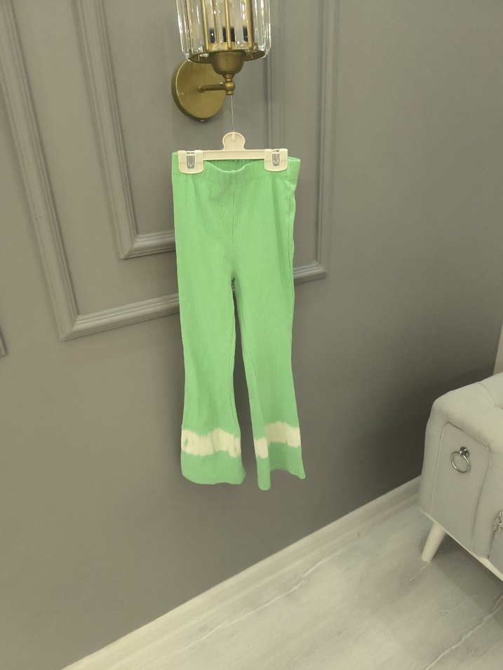 Kız çocukları için yeşil triko kumaştan, pastel bağlama desenli, rahat ve şık bir pantolon.