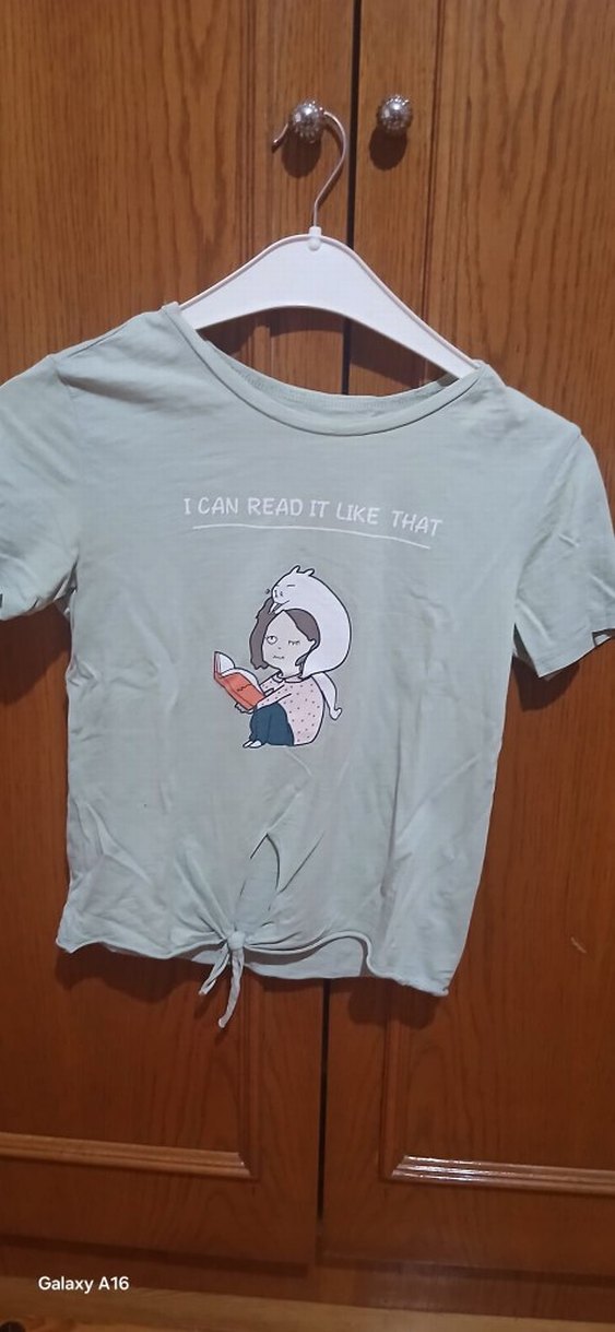 Pamuklu kumaştan yapılmış, kısa kollu ve yuvarlak yaka yeşil kız çocuk tişörtü. Altında düğüm detayı ve baskılı desen bulunur.
