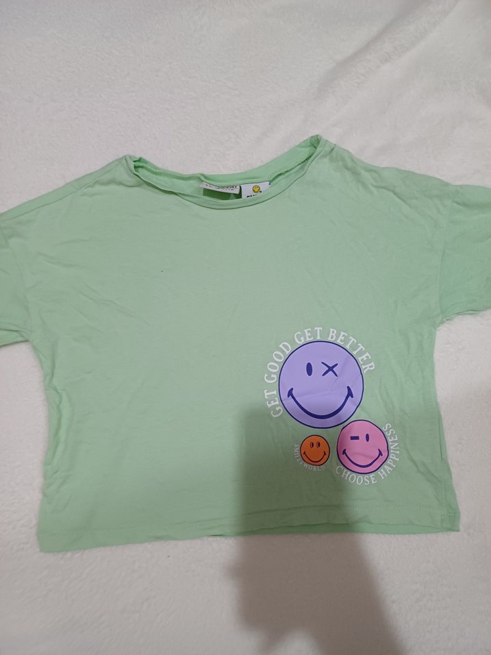 Kısa kollu, yuvarlak yakalı yeşil kız çocuk tişörtü, baskılı gülen yüzler ve düğme detaylarıyla. Rahat ve salaş kesim, sokak stiline uygun.