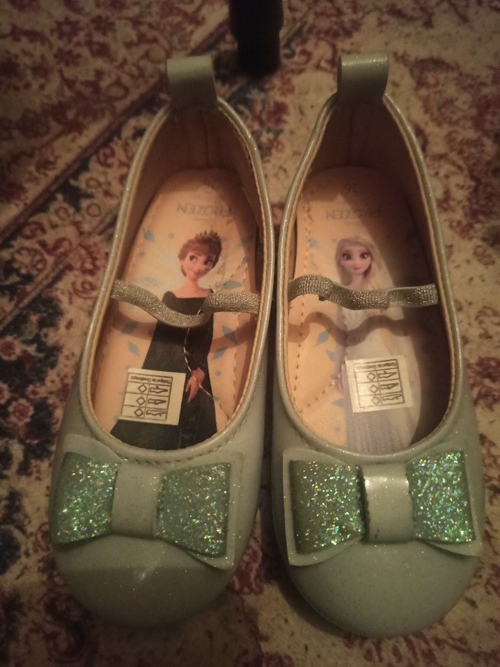 Kız çocuklar için lastik malzemeden yapılmış, tokalı bantlı ve baskılı desenli yeşil babetler. Önünde simli fiyonk detayları bulunur.