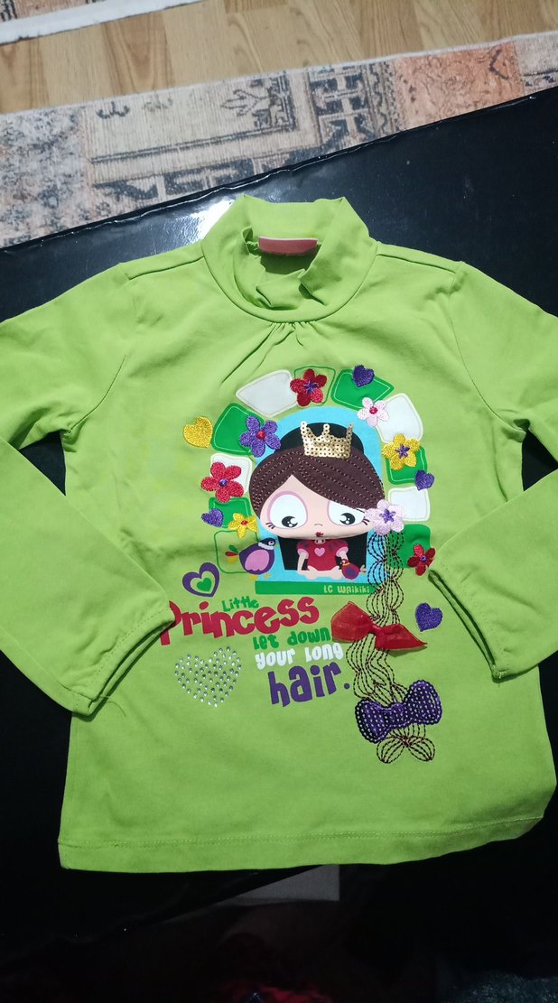 Yeşil, uzun kollu kız çocuk tişörtü, baskılı ve örgü detaylıdır. Yumuşak ve sıcak kumaştan üretilmiş, bisiklet yaka ve sokak stili sunar. Prenses temalı renkli baskı mevcuttur.