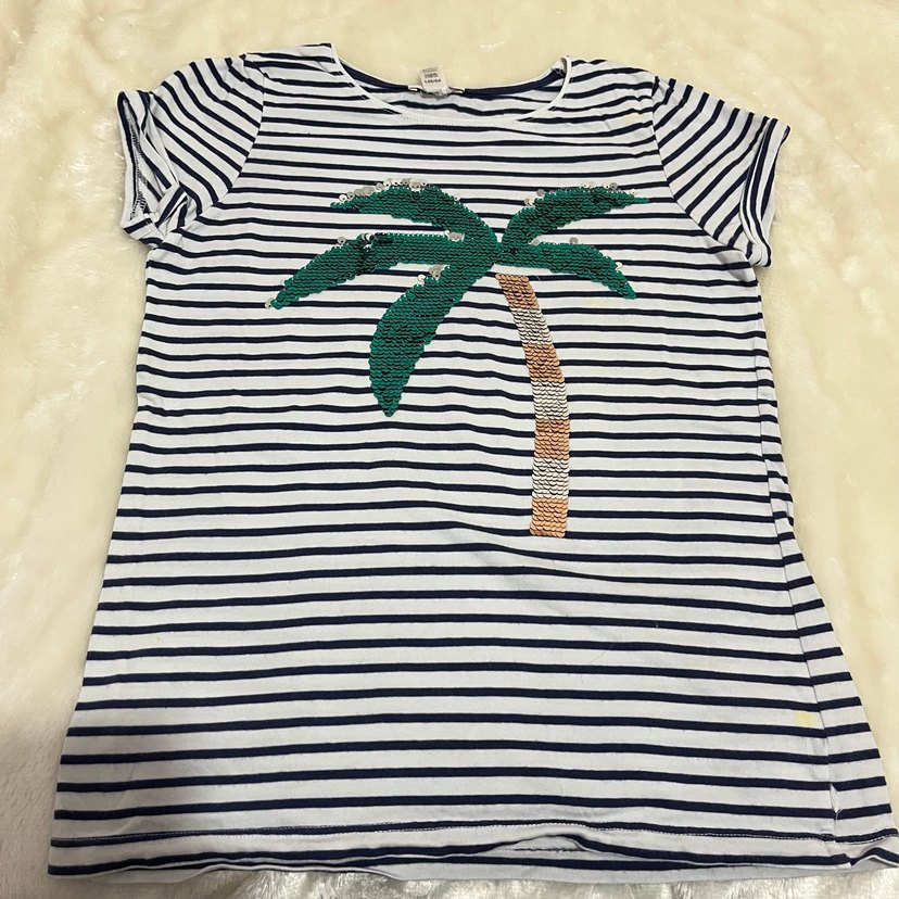 Kısa kollu, yakası yuvarlak, vücuda oturan kız çocuk tişörtü. Çizgili kumaş üzerine boncuk işlemeli yeşil palmiye deseni bulunur.
