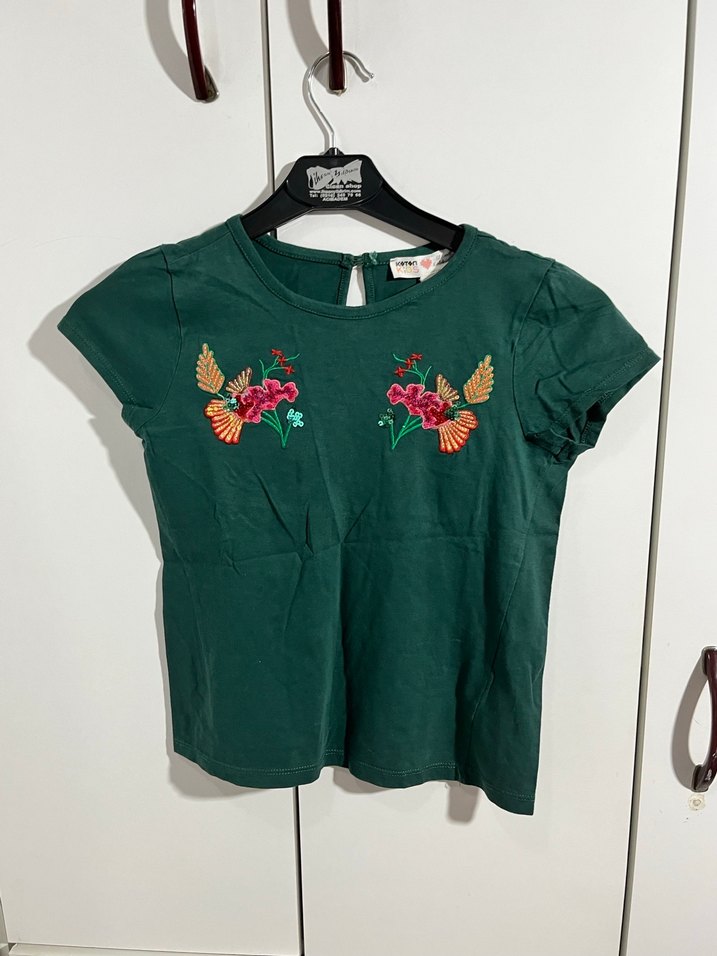 Bu bol kesim yeşil kız çocuk tişörtü kısa kollu, yuvarlak yaka ve işlemeli çiçek desenlidir. Bohem tarzda, arkada düğme detaylı, yumuşak kumaştan yapılmıştır.