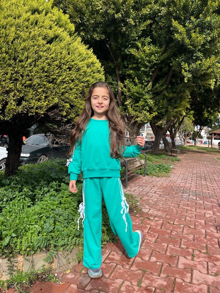 Kız çocukları için bol kesim, uzun kollu, yuvarlak yakalı, yumuşak ve sıcak kumaştan yapılmış yeşil çizgili eşofman takımı. 4.5, 5.6, 7.8 ve 11.12 yaş seçenekleri mevcut. Fiyat: 400₺.