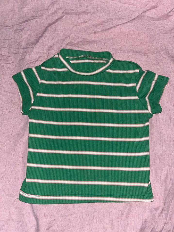 Kısa kollu, boğazlı ve fitted kesimli kız çocuk triko. Yumuşak triko kumaştan, pastel yeşil-beyaz çizgili, rahat sokak stili için uygun.
