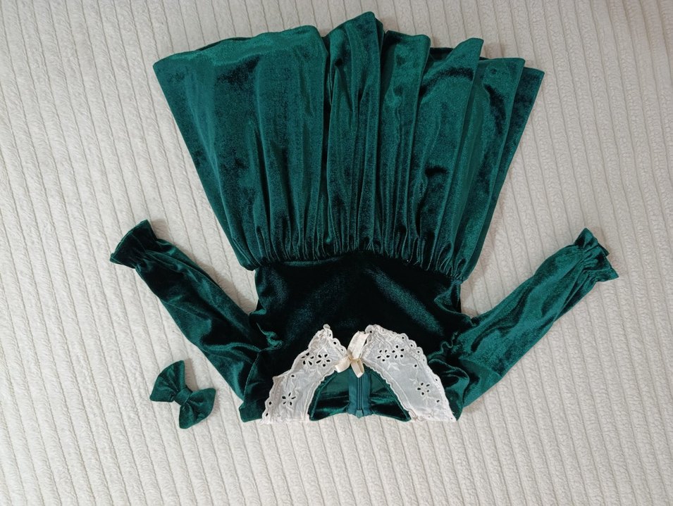 özel dikim Yeşil bohem tarzı kız çocuk elbisesi, uzun kollu, bol kesim ve V yaka dantel işlemeli detaylara sahiptir.