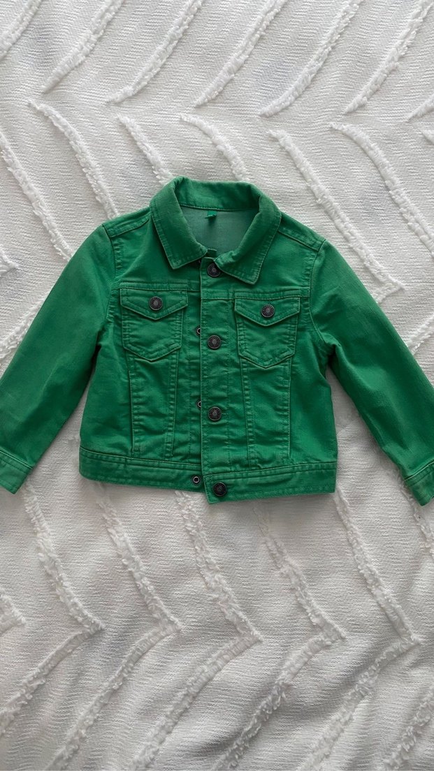 Yeşil renkli, düğmeli, notalı yaka detaylı, fitted kesim kız çocuk denim ceketi.