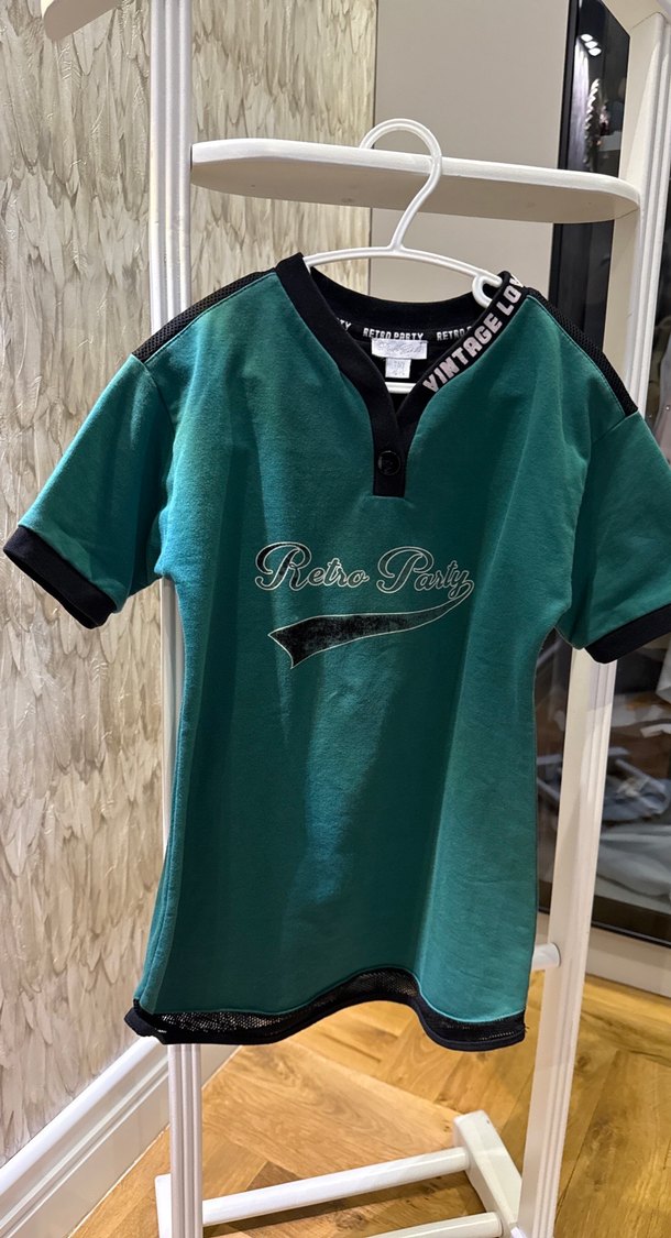 Koyu yeşil renkli kız çocuk kısa kollu ve yuvarlak yakalıdır elbise Retro Party baskılı, düğmeli detaylara sahip ve sentetik kumaştan üretilmiştir.