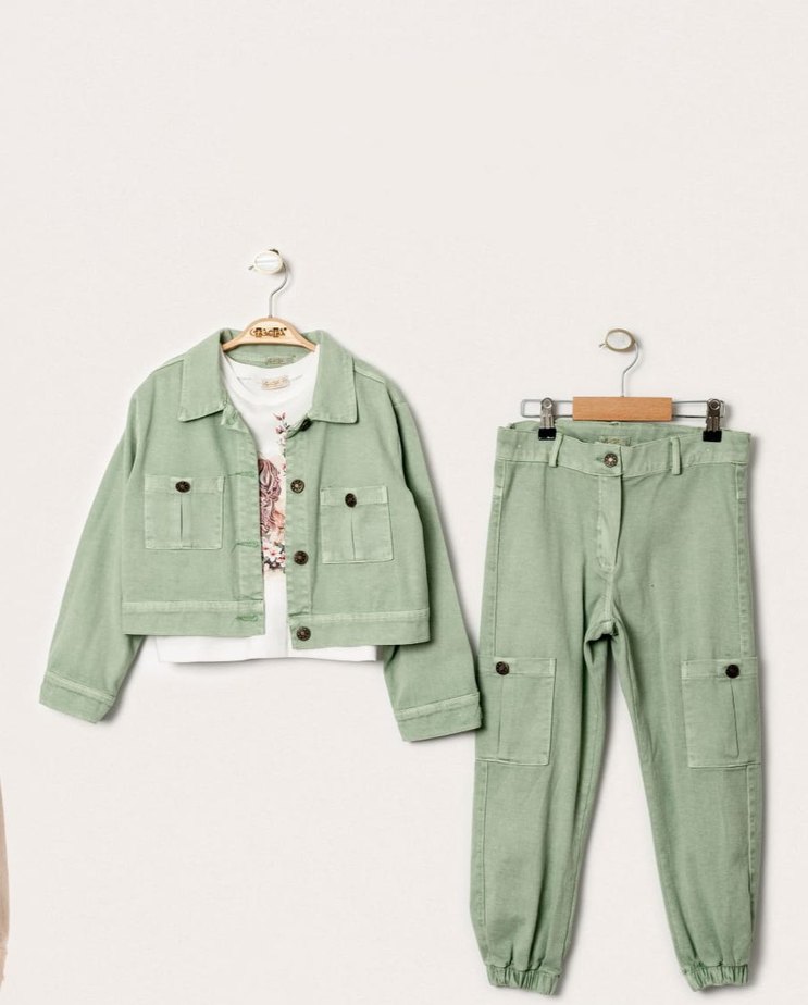 Kız çocukları için düğmeli, yeşil pamuklu, bol kesim, yakalı ceket ve pantolondan oluşan takım. Doğal yeşil tonlarda ve batik desenli.