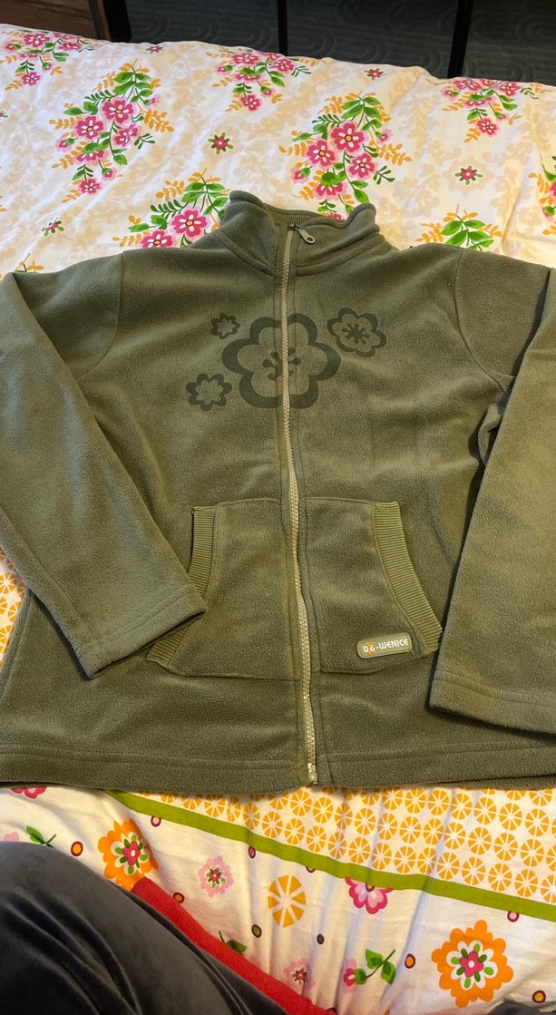 Kız çocukları için yeşil renkte, fermuarlı ve crew neck yakalı, çiçek desenli, iki ön cepli fitted polar. İki kol altı ölçüsü 49 cm ve ürün esnek yapıya sahiptir.Defosuzdur.