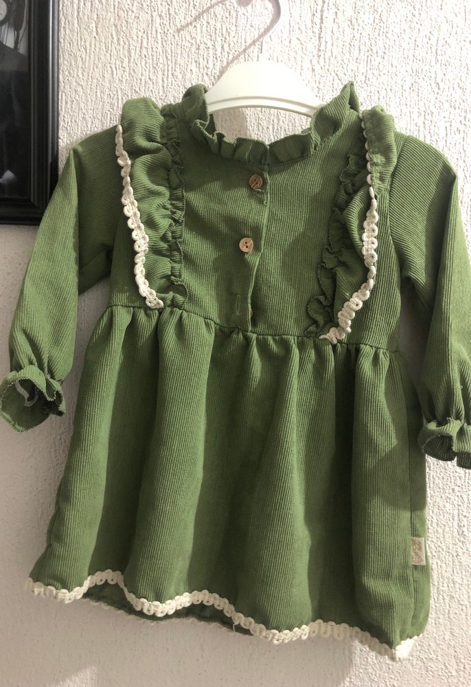 Uzun kollu, keten kumaşlı, fırfır detaylı ve nakışlı yeşil kız çocuk elbisesi. Bohem tarzında, yuvarlak yakalı ve bol kesim.
