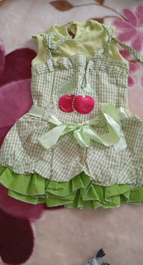 Kız çocuk elbise, straplez ve askılı tasarımıyla, nakışlı detaylar ve yeşil fırfırlı katmanlarla tamamlanmıştır. Sentetik kumaştan üretilmiştir.