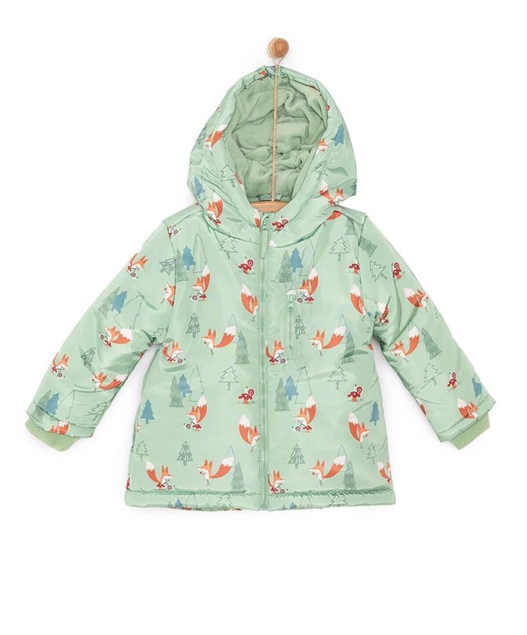 Kız çocukları için kapüşonlu, kürklü detaylı, bol kesim mont. Yumuşak ve sıcak kumaştan, pastel yeşil renkli ve desenli.