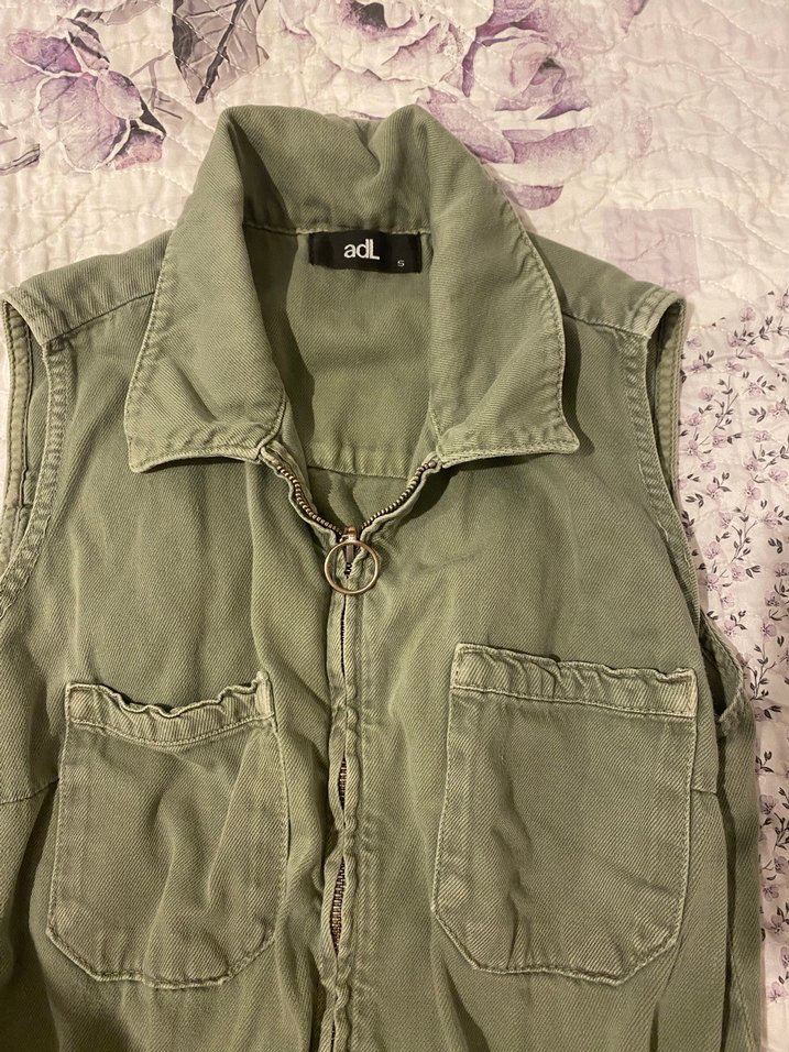 Keten kumaştan yapılmış, yeşil renkli, fermuarlı ve yakalı kolsuz tulum İki ön cepli, bol kesim,sokak tarzına uygun.