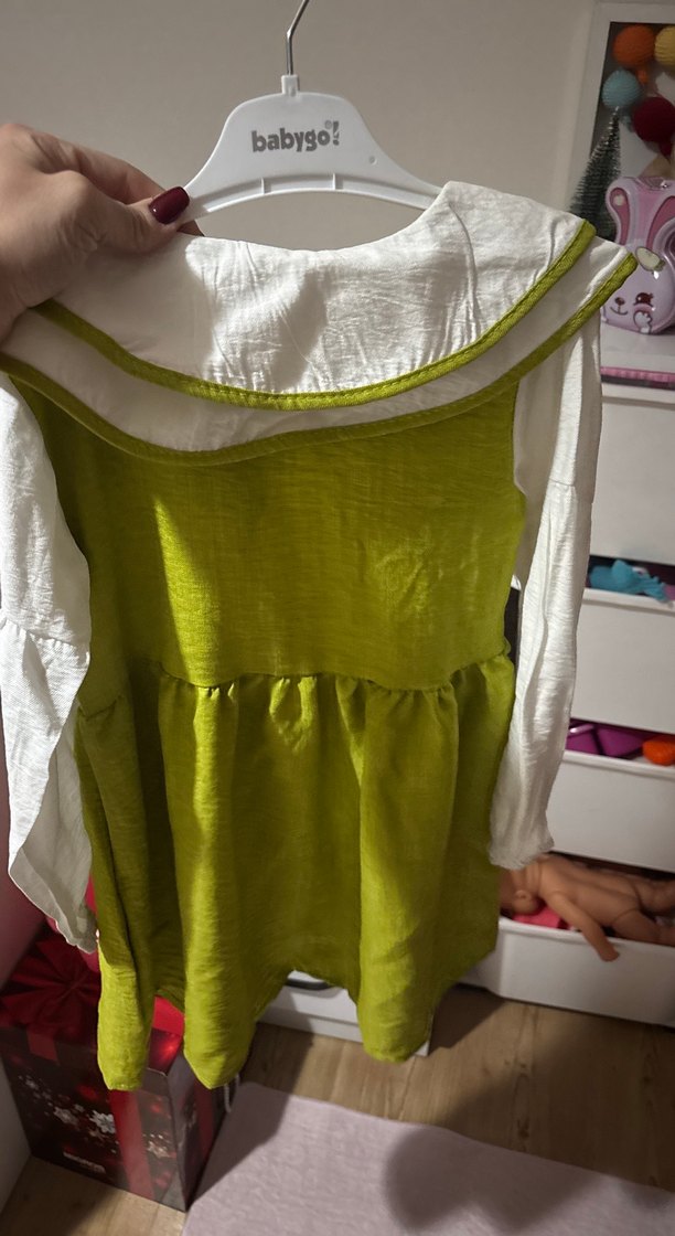 Keten kumaştan, fırfırlı ve askısız yakalı, salaş kesim yeşil elbise. Bohem tarzı ile modaya uygun bir seçim. Hiç giyilmedi