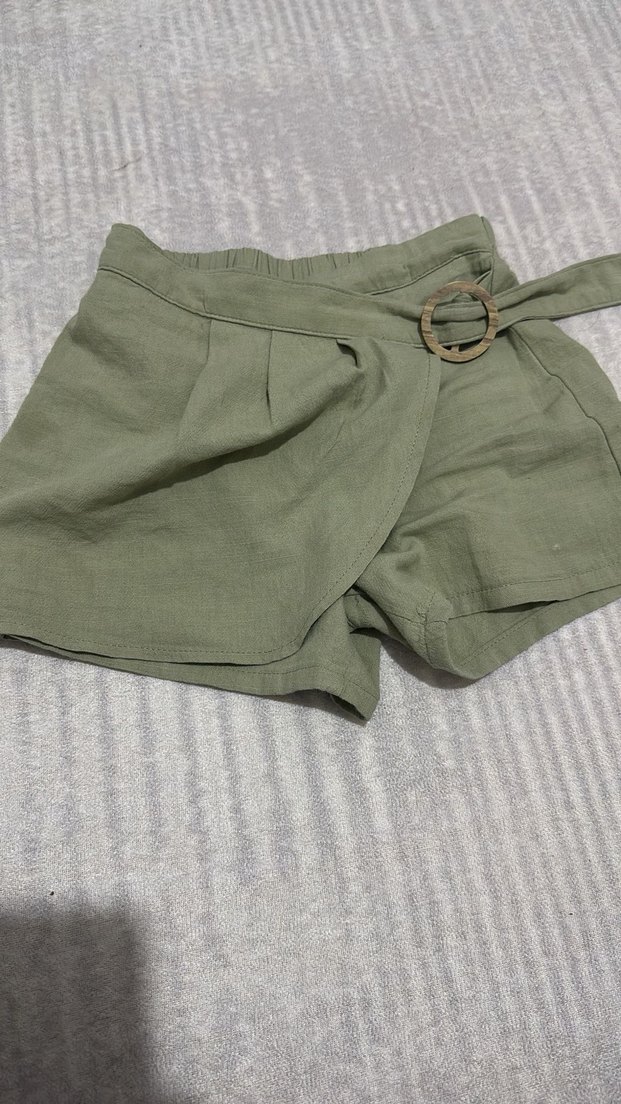 Kız çocuk kemerli ve bol kesim yeşil keten mini şort. Rahat ve günlük sokak stili için uygundur.
