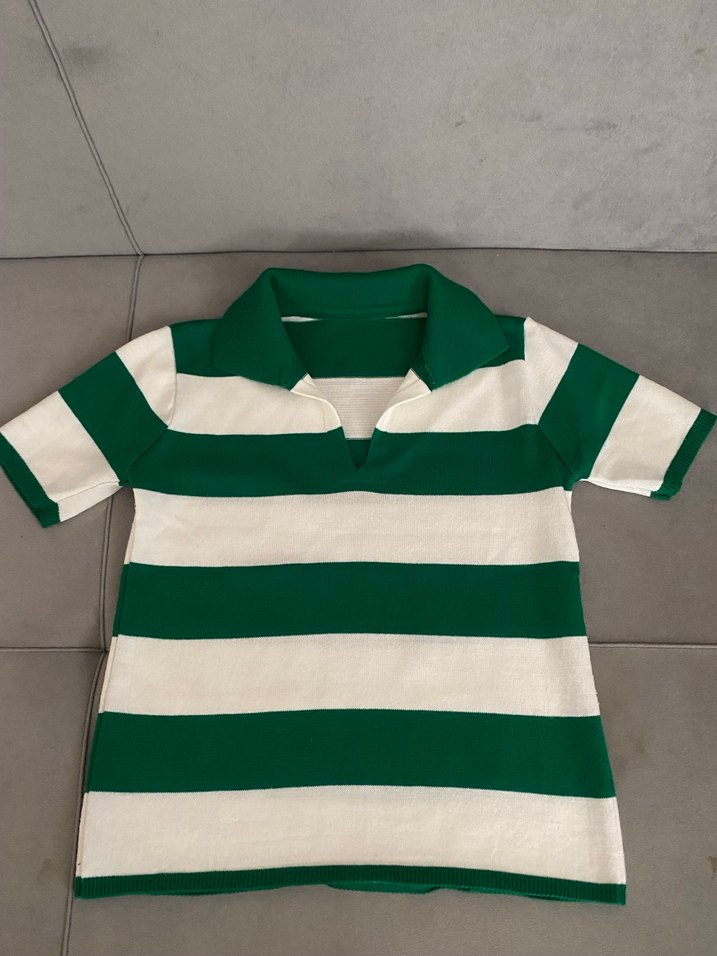 Erkek çocuk için kısa kollu, yakalı, fitted kesim polo tişört. Yeşil ve beyaz geniş çizgili, sentetik örme kumaştan, günlük sokak stili için uygundur.