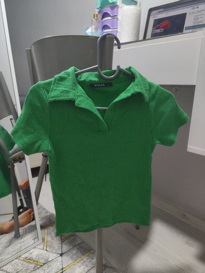 Yeşil, kısa kollu, yakalı ve fitted kesim kız çocuk polo tişört. Örgü yün kumaştan, parlak görünümlü, sokak stiline uygun.