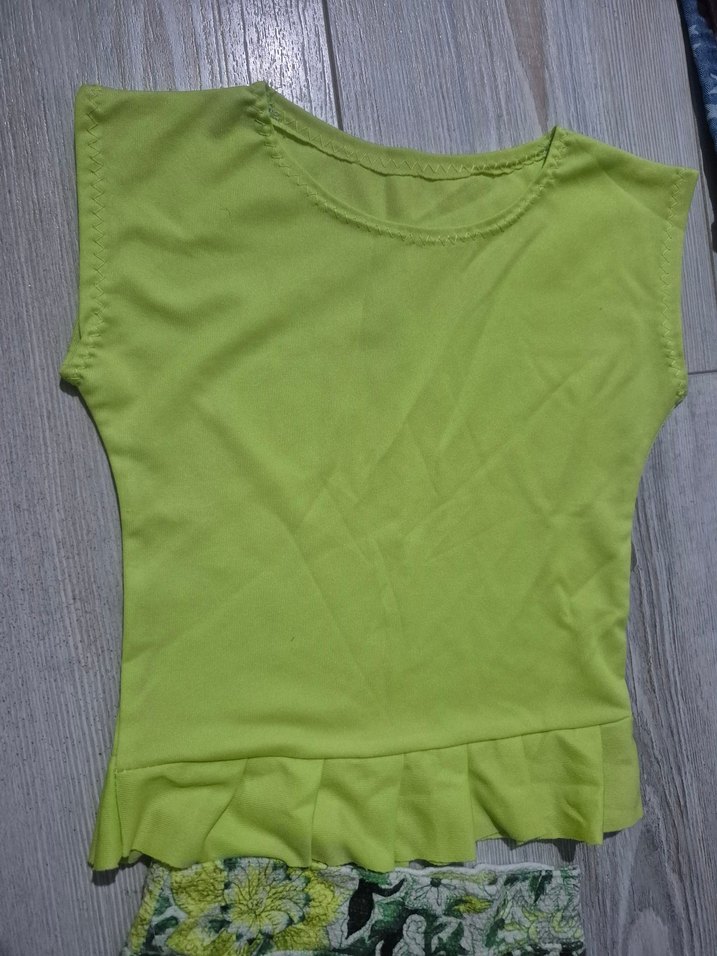 Yuvarlak yaka, kolsuz, bol kesim yeşil kız çocuk tişörtü. Alt kısmında fırfır detayı bulunur. Yumuşak sentetik kumaştan üretilmiştir.ve etek