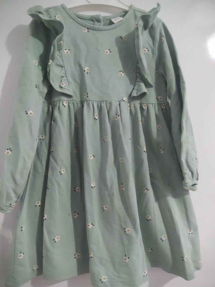 Pastel yeşil kız çocuk elbise, uzun kollu ve yuvarlak yakalıdır. Nakışlı desenleri ve fırfır detaylarıyla sentetik kumaştan üretilmiştir.