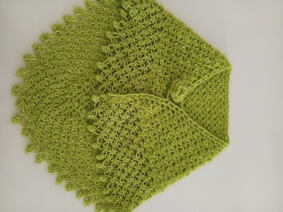 Yeşil renkli, örgü kız çocuk ponchosu, bol kesim ve kayık yaka detaylı, sade bohem tarzda ve askılı kollu.