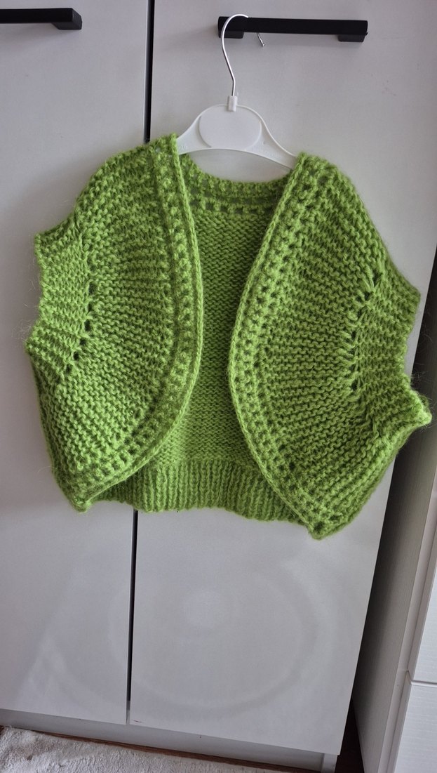 Yeşil renkte, örgüden yapılmış kız çocuk bolero, bol kesim ve kolsuz tasarıma sahip, bohem tarzında rahat bir üründür. sıfır 7-8 yaş