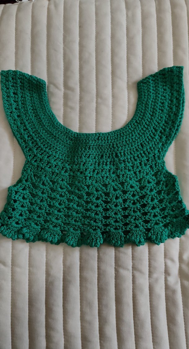 Kız çocukları için, tek renkli yeşil örgü bolero, kayık yaka ve fırfır detaylarıyla bol kesim ve bohem tarz sunar.