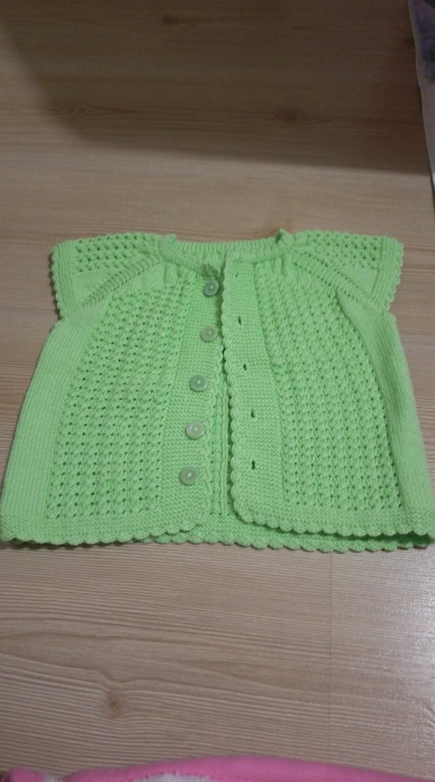 Kız çocukları için pastel yeşil renkte, örgü kumaştan yapılmış kolsuz, bol kesim hırka. Düz ve düğmeli ön tasarıma sahip. hiç giyilmedi organik ipten örüldü 1 yaş iki yasa uyar