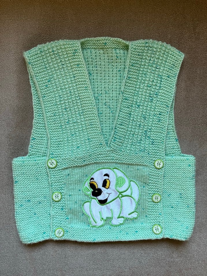 Bu yeşil renkli, kız çocukları için örme triko süveter, kolsuz, balıkçı yaka ve renkli nakışlı köpek desenine sahiptir. Trendy rahat sokak stili için uygundur.