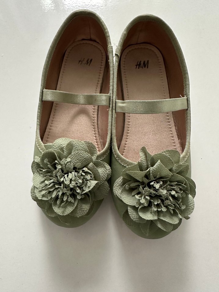 Yeşil renkli, pileli ve çiçek desenli sentetik kumaştan yapılmış kız çocuk babetleri, bohem ve klasik şıklığı bir arada sunar.