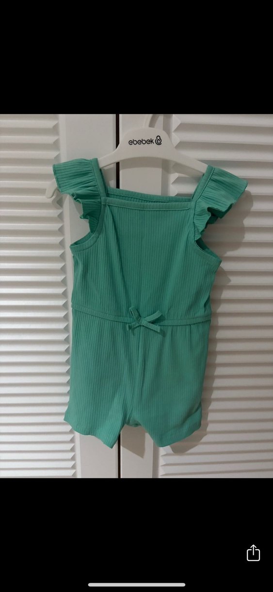 Kız çocukları için piliseli askılı, fitted kesim tulum. Pastel yeşil renkte, yumuşak sentetik kumaştan, 6-9 ay