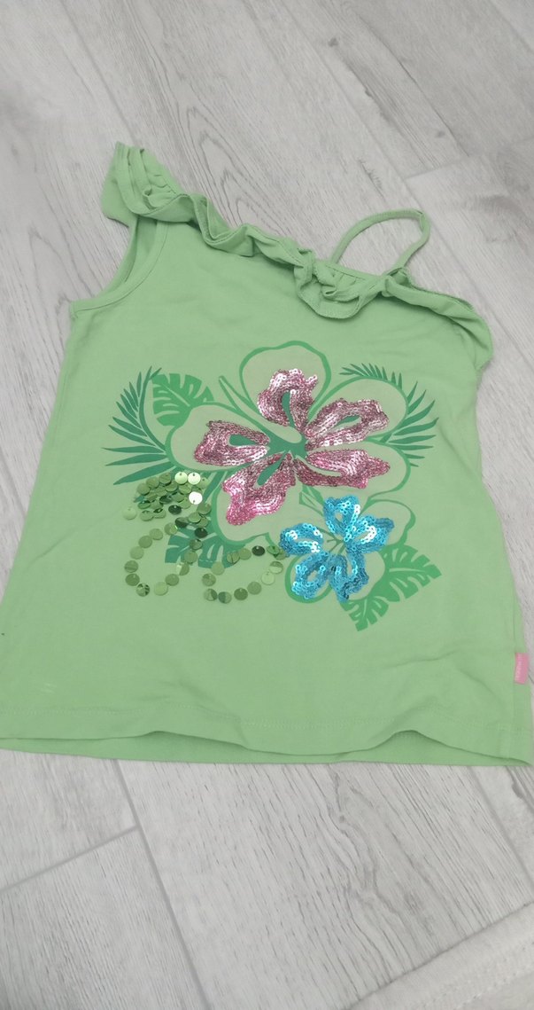 Yeşil renkli, straplez kesim kız çocuk tişörtü, pul işlemeli ve renkli çiçek desenli. Sentetik kumaştan, bol kesim ve bohem tarzda.