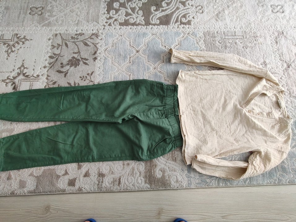 YENİ GİBİ İKİ KEZ GİYİLDİ 8*9 YAŞ..kız çocuklar için yeşil renkte, keten kumaştan yapılmış, rahat kesim pantolon. Normcore tarzında ve zahmetsiz şıklık sunar.