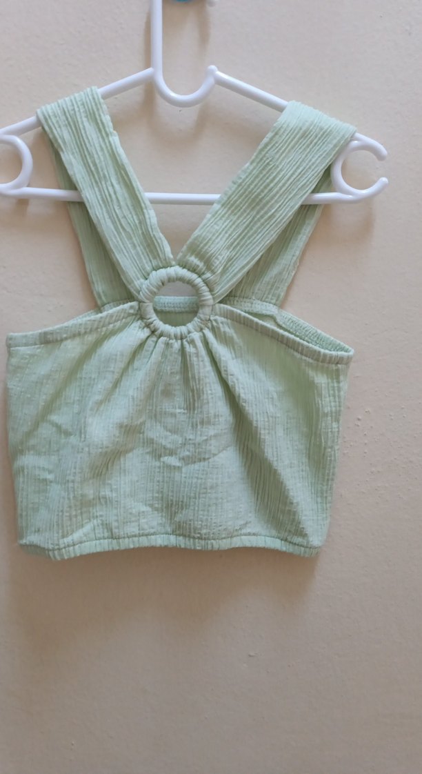 kız çocuk açık yeşil renkle lastikli önü halka detaylı kolsuz krop