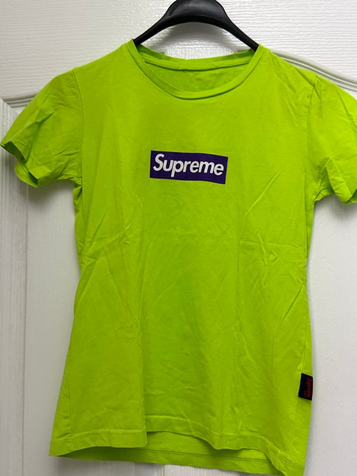Yeşil renkli, dar kesim kız çocuk tişörtü, kısa kollu ve yuvarlak yaka. Önünde renkli Supreme baskısı bulunur.