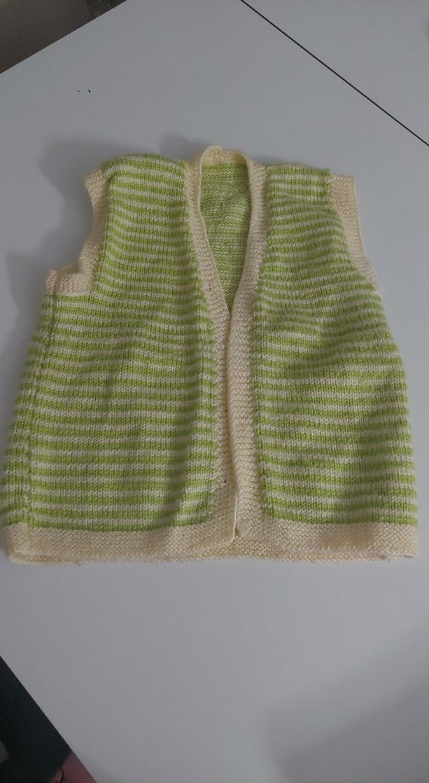 Kız çocuk için yeşil triko süveter, V yaka ve kolsuz tasarıma sahiptir. Açık yeşil ve krem çizgili örme deseniyle sade ve bohem tarzda.
