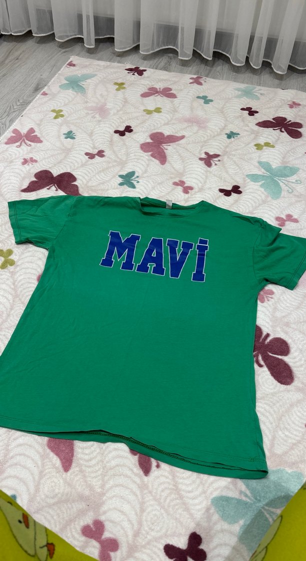 Yeşil renkli, V yaka ve bol kesimli kız çocuk tişörtü. Kısa kollu ve önünde büyük "MAVİ" baskısı bulunur, yumuşak dokulu kumaştan.