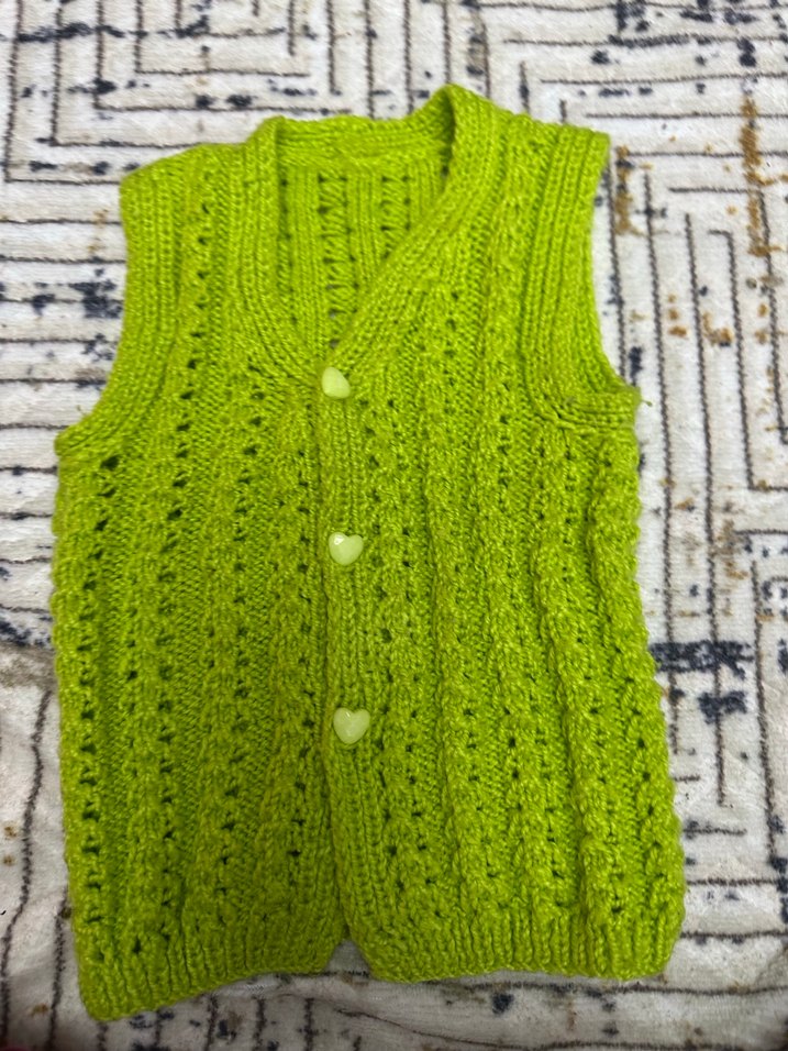 Kız çocukları için canlı yeşil renkte, V yakalı ve kalp şeklinde düğmeli, bohem tarzda, örgü ve kolsuz, dar kesim yelek.